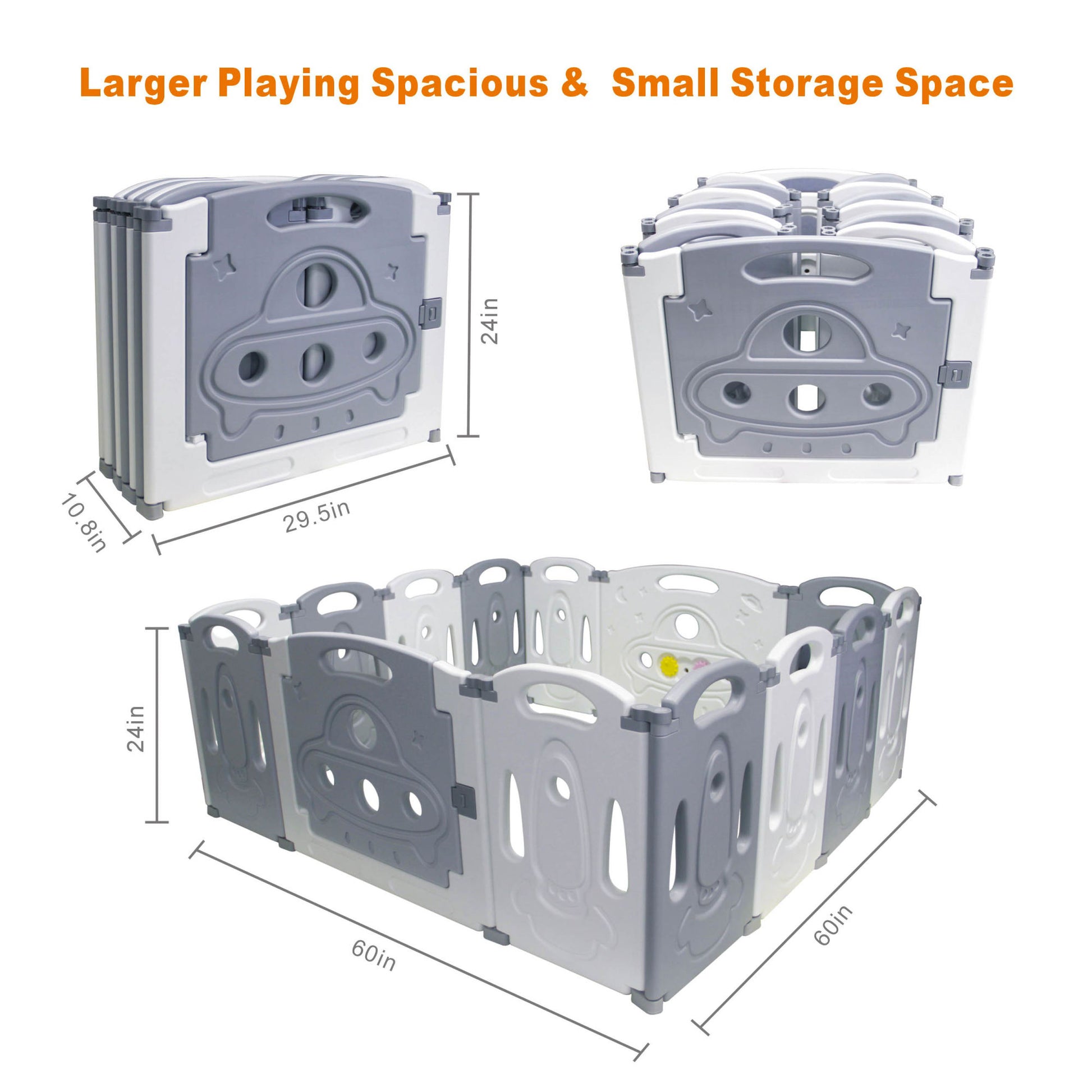 Larger Spacious: The size 14 pieces panels shown in the picture is 60x60x24inches .Enough for 1-2 children to play in the safety activity centre.